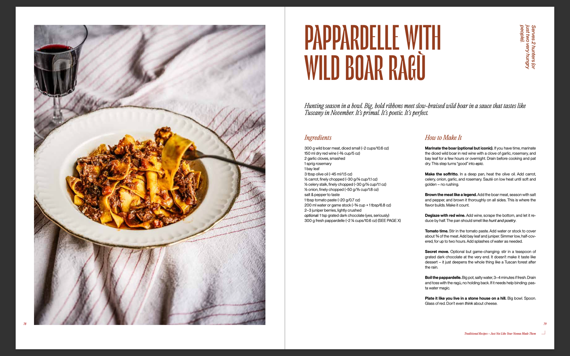 176 pages of unapologetic pasta worship: high-voltage photography, recipes that bounce between Italian classics and “did-we-just-invent-that?” twists, and a sprinkling of our trademark kitchen sass.