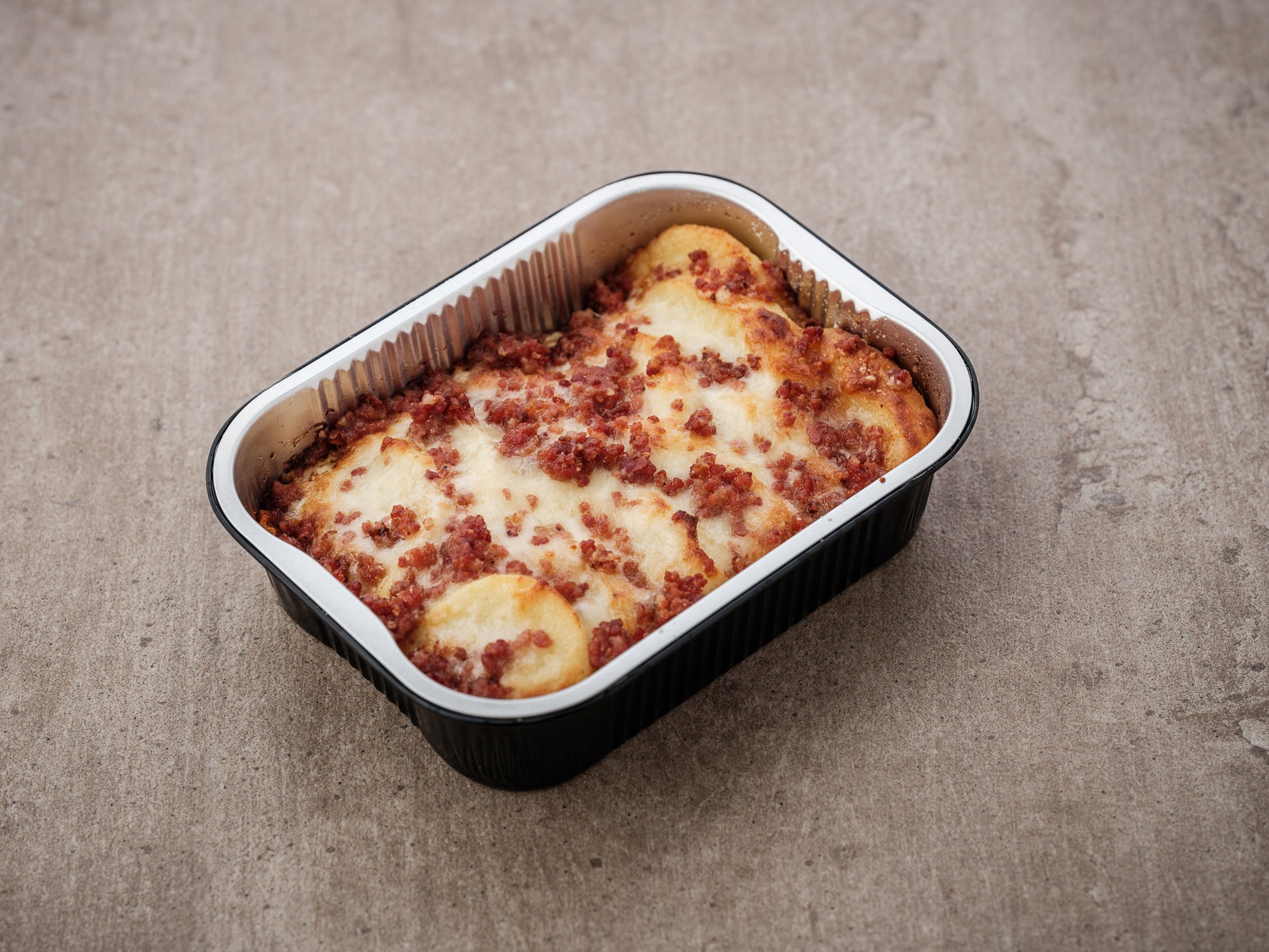 Classic semolino gnocchi from Rome, ready to be baked. Topped with prosciutto crudo di Parma, mozzarella, formaggio di malga and a generous amount of butter.